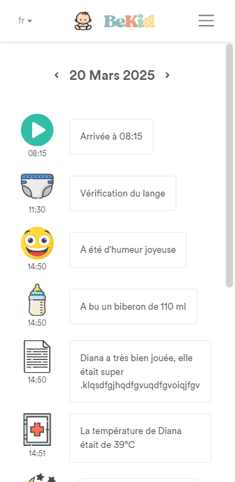 Visualisez en un coup d’œil les présences, le planning quotidien et les informations médicales ou pratiques importantes concernant chaque enfant. Enregistrez facilement les activités effectuées, les soins apportés et partagez instantanément les informations avec les parents via l’application dédiée.